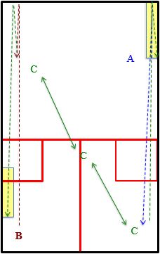 • Le joueur B distribue de l’arrière une balle parallèle vers l’avant.