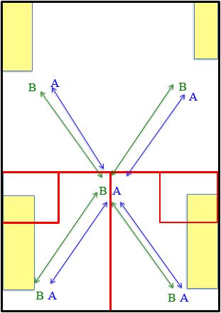 Les 2 joueurs jouent de l’arrière ou de l’avant en parallèle. Ils peuvent jouer de l’arrière en double-mur.