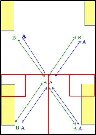 Les 2 joueurs peuvent jouer sur tout le court en parallèle, en croisé et en double-mur.