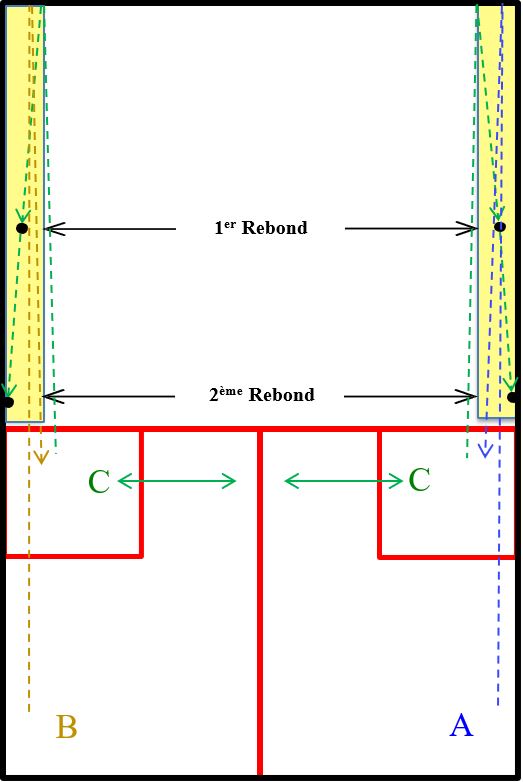 - Le joueur B distribue une balle parallèle à mi-court.