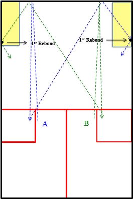 - Le joueur A s’envoie une balle parallèle proche du T, en cloche à mi-court, puis réalise une volée frappe courte croisée en cherchant le nick.