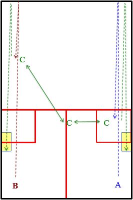 - Le joueur A distribue une balle parallèle de l’arrière, le joueur C exécute une volée parallèle,