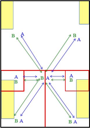 - Les 2 joueurs jouent de l’arrière en parallèle ou en croisé en zone 2 ou 3 du mur frontal.